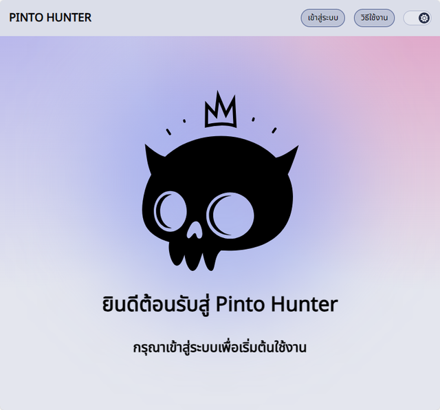 กลับไปที่ Pinto Hunter กดปุ่มเข้าสู่ระบบ (หรือกดปุ่มเข้าสู่ระบบจาก Extension ก็ได้) จากนั้นนำ Fiction Token วางลงในช่องที่กำหนด และกดตรวจสอบ